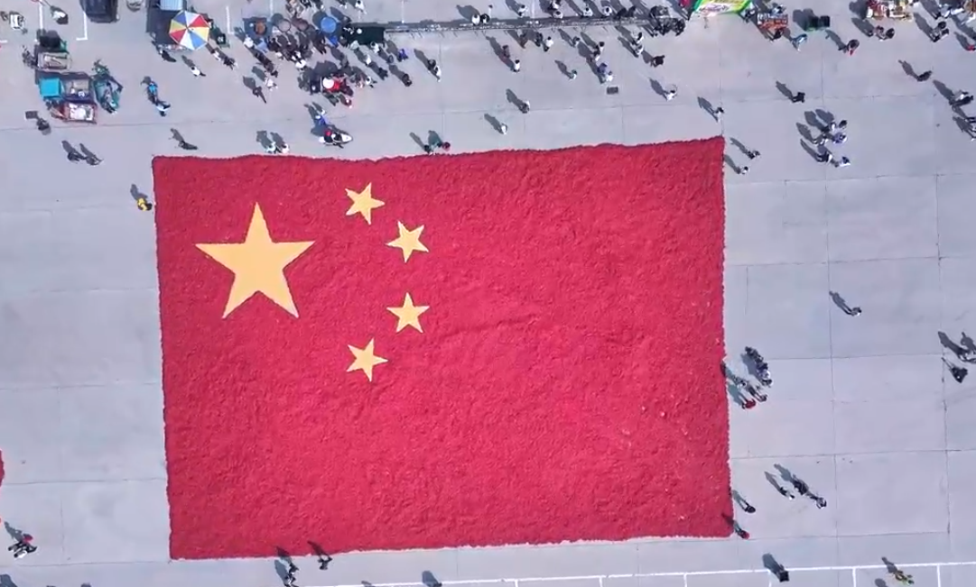 在中华人民共和国成立76周年之际,内蒙古巴彦淖尔市临河区农民用12吨红辣椒摆出巨幅五星红旗,表达了临河区人民对伟大祖国深深的爱。