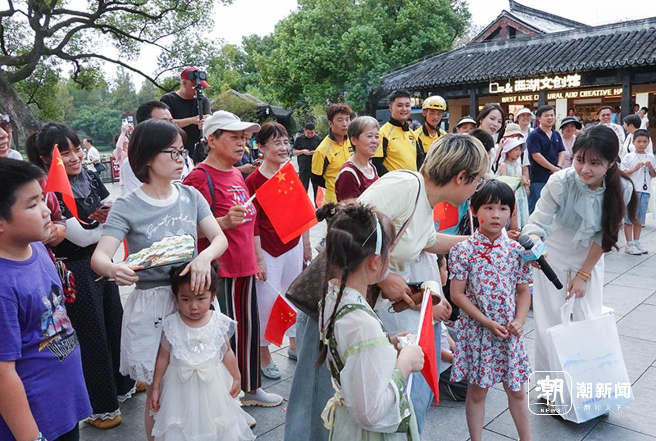 下午3点,随着开场节目《湖鼓韵影》气势如虹的鼓点响起,活动正式拉开帷幕,瞬间点燃现场气氛。杭州学军中学教育集团文渊实验学校的同学们紧接着登场,以一首《万疆》展现青春风采,清澈歌声与飒爽舞步中,尽显新时代青年的蓬勃朝气,引得现场观众连连称赞,驻足观看的塞尔维亚和马来西亚的游客感慨道,“今天刚从无锡到杭州,上午去看了六和塔,下午逛西湖。虽然很热,但西湖很美,更幸运的是碰到了今天的演出,很精彩。”