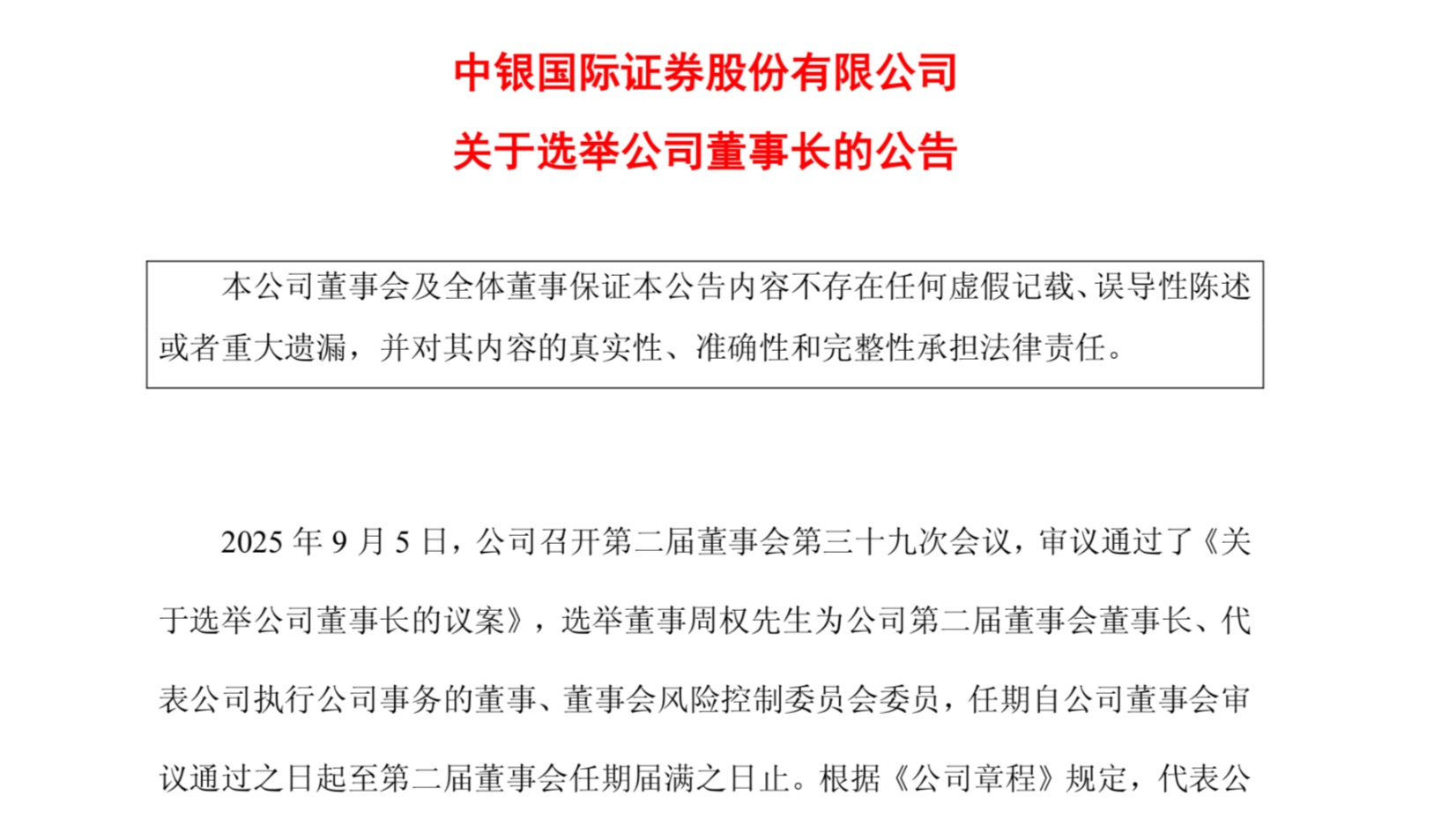 - 中银证券近日发布董事长变更公告,选举周权为董事长。