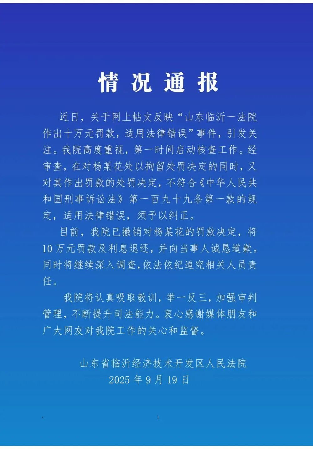 9月19日,临沂经济开发区人民法院(下称临沂经开区法院)发布情况通报:经核查,在对杨某花处以15日拘留决定的同时,又对其作出罚款的处罚决定,不符合《中华人民共和国刑事诉讼法》第一百九十九条第一款之规定,系适用法律错误,应依法予以纠正。目前,我院已撤销对杨某花的罚款决定,将10万元罚款及利息退还,并向当事人诚恳道歉。 同时将继续深入调查,依法依纪追究相关人员责任。