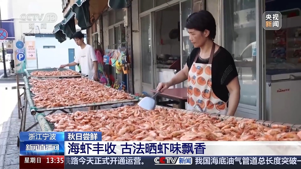 眼下,正是海虾丰收季。在浙江宁波市宁海县强蛟镇,村民们沿用古法将新鲜海虾制作成虾干,晒出的虾干供不应求,众多游客前来采购。