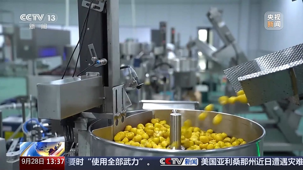 与此同时,板栗加工厂也在忙着赶订单。新鲜收获的板栗可以做成袋装零食,附加值更高了。