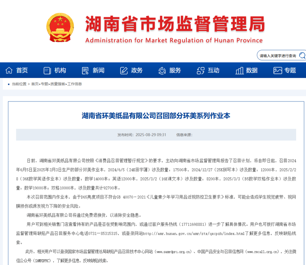 湖南省环美纸品有限公司同样主动报告了召回计划:自2025年8月29日起,召回2024年6月5日至2025年3月3日生产的部分环美作业本,2024/6/5(24K田字薄)涉及数量:17500本,2024/12/27(25K拼写本)涉及数量:12000本,2025/2/28(36K数学英语作业本)涉及数量:数学14000本;英语12000本,2025/3/2(16K课文本)涉及数量:8200本,2025/3/3(B5数学双格作业本)涉及数量:数学19000本;双格10000本,涉及数量共计92700本。