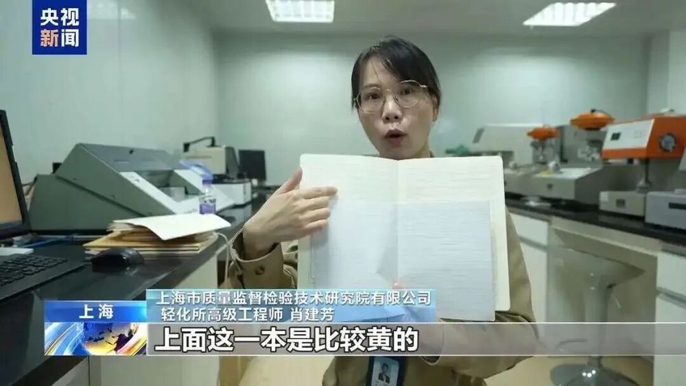 上海市质量监督检验技术研究院有限公司轻化所高级工程师 肖建芳:这两个本子,通过肉眼可以看到上面这一本比较黄,下面这一本比较白,白得发亮。我们通过白度仪检测,看一下这两个本子的亮度值如何。