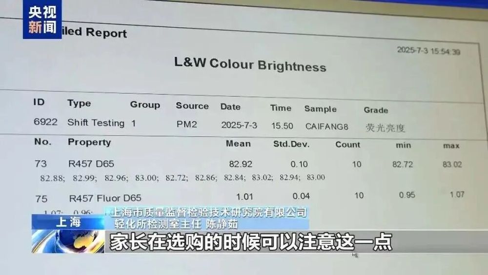 上海市质量监督检验技术研究院有限公司轻化所高级工程师 肖建芳:刚才我们对这一批复印纸进行了测试,可以看到现在复印纸的D65亮度数值都超过了100%。国家对复印纸的D65亮度要求应该小于等于95.0%,现在已经大于100%了,远超过国家标准要求。而且学生用品对于D65亮度的要求应该小于等于85.0%,如果学生一旦使用这种市面上所售卖的高亮度复印纸的话,长期使用可能会对视力产生不利影响。