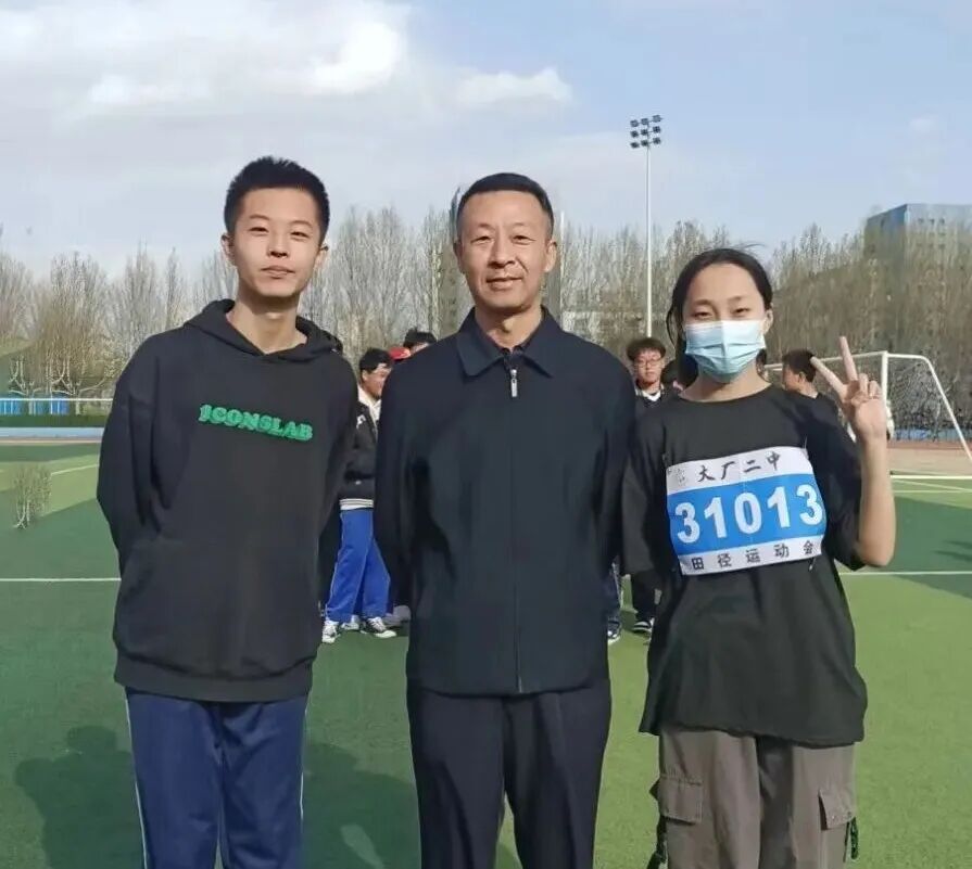 王立忠(中)在学校运动会上与学生合影